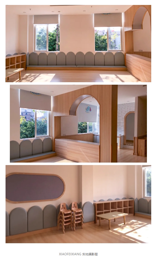 空間主要以白色、木色、灰色來營造溫暖、自然的氛圍,設計師希望以童心去構想具有無限想象力的空間,同時創造出多變豐富具有探索性的空間,不同造型的門洞,增加了空間趣味性,也將呆板的空間變得靈動,自然樹的造型讓小朋友雖在室內,卻依然有擁抱戶外的感覺。一切以孩子出發,一切為了孩子.......