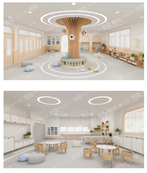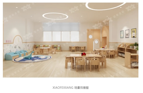 在幼兒空間的設計中,以國際化精品早教課程為依托、小朋友自然生長規律為依據,每個空間均以功能出發,設置動、靜區域及生活、教學區域,而整個園區以課程出發設計親子閱讀、兒童活動室、功能教室等多元化區域。