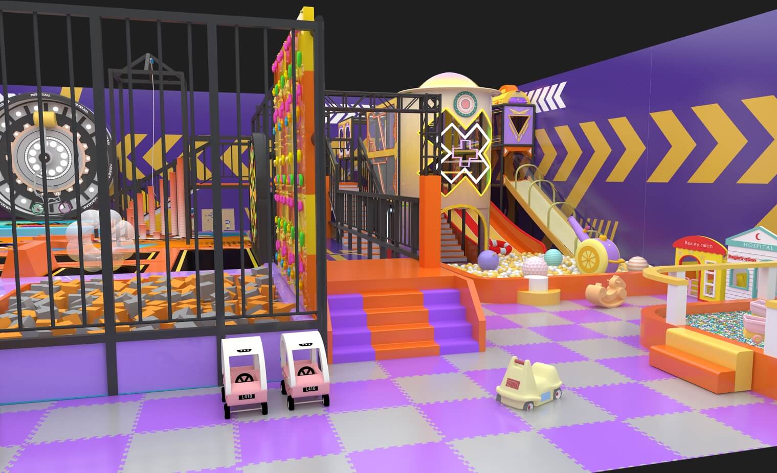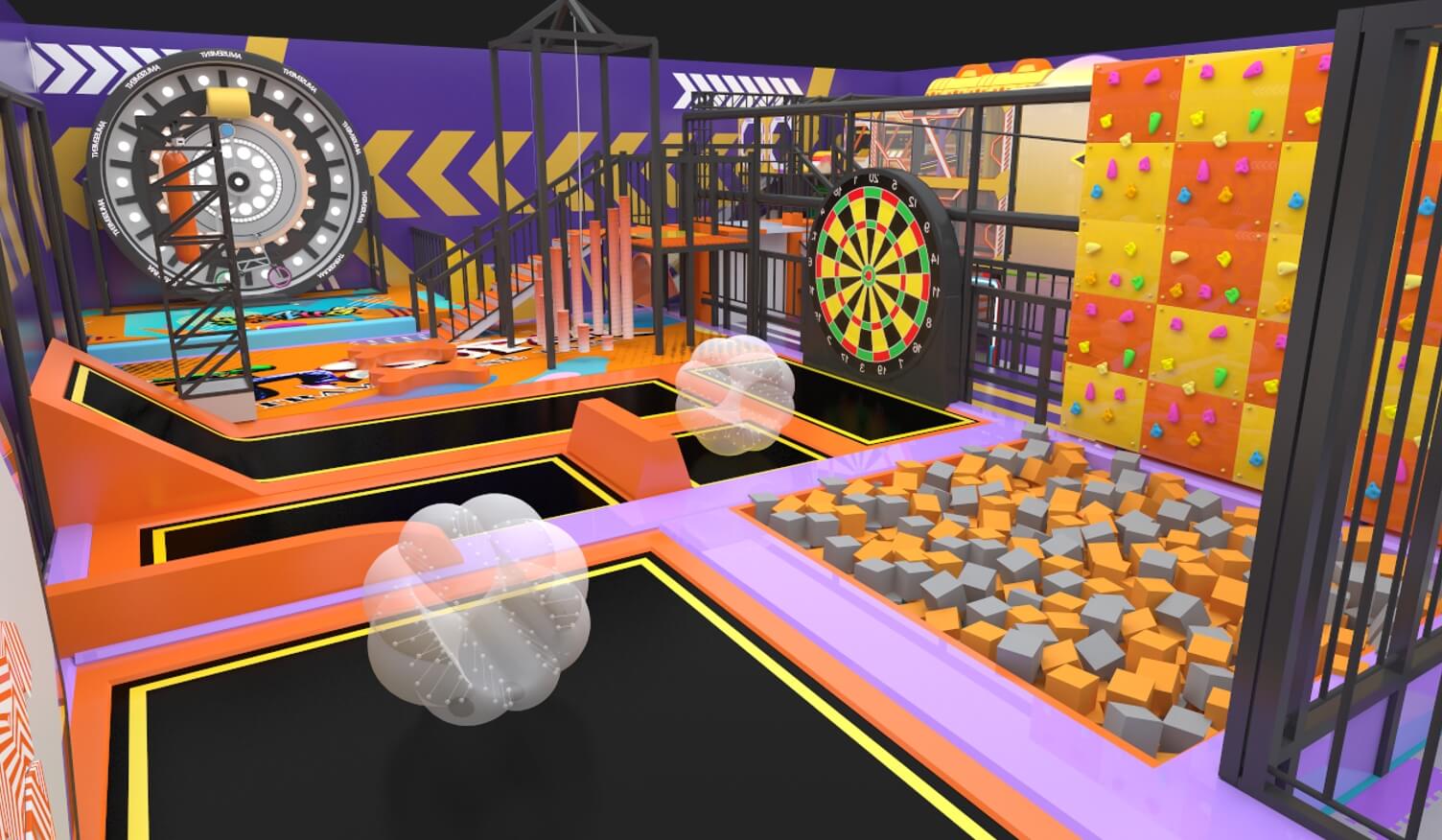 設計理念:樂園以“潮流運動”為主題,通過空間敘事將潮流基因、創意表達與個性主張融入三維場域。我們采用運動娛樂化的沉浸式場景架構,結合動線規劃與新型游樂設備,構建兼具潮流打卡與互動體驗的復合型玩娛空間,滿足Z世代對個性表達與社交分享的雙重需求。