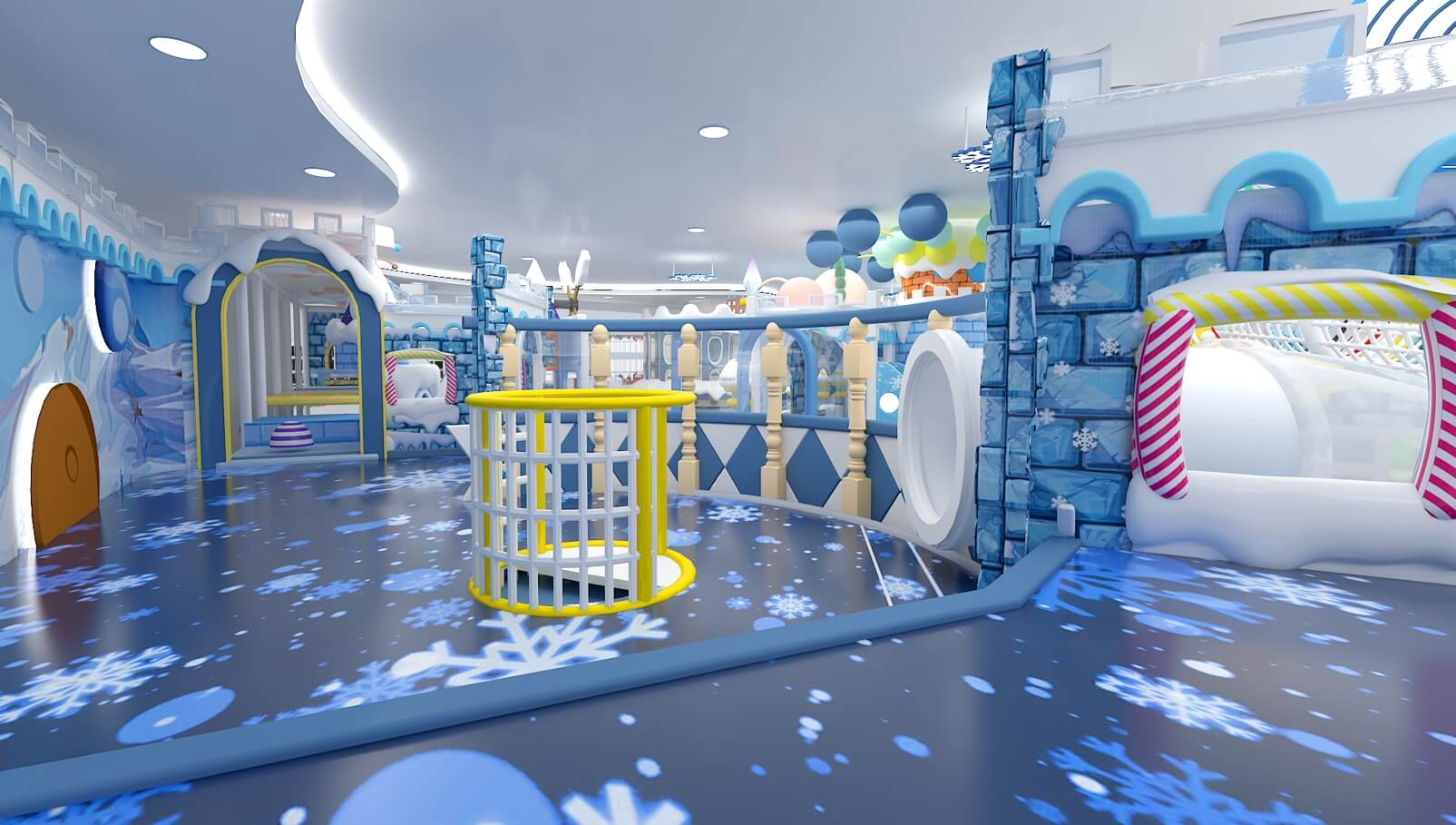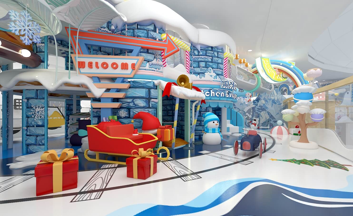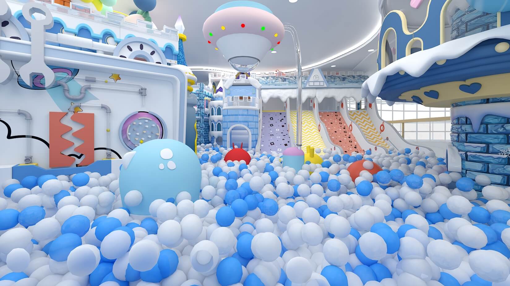 設計理念:皚皚白雪、剔透冰晶與冬日晴空,本應勾勒出冷色調的畫卷,而這座童話王國卻喚醒我們每一個人童年的靈動。樂園以“冰雪童話”為創作背景,以莫蘭迪色為色彩基調,通過穩定多樣的幾何造型構筑多維空間,營造差異化的冰雪場景,大人、孩子們置身其中,仿佛穿越到寒冷的冰川雪原探險。