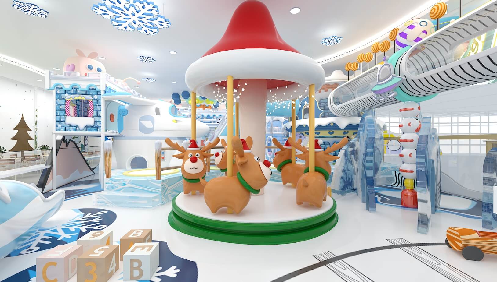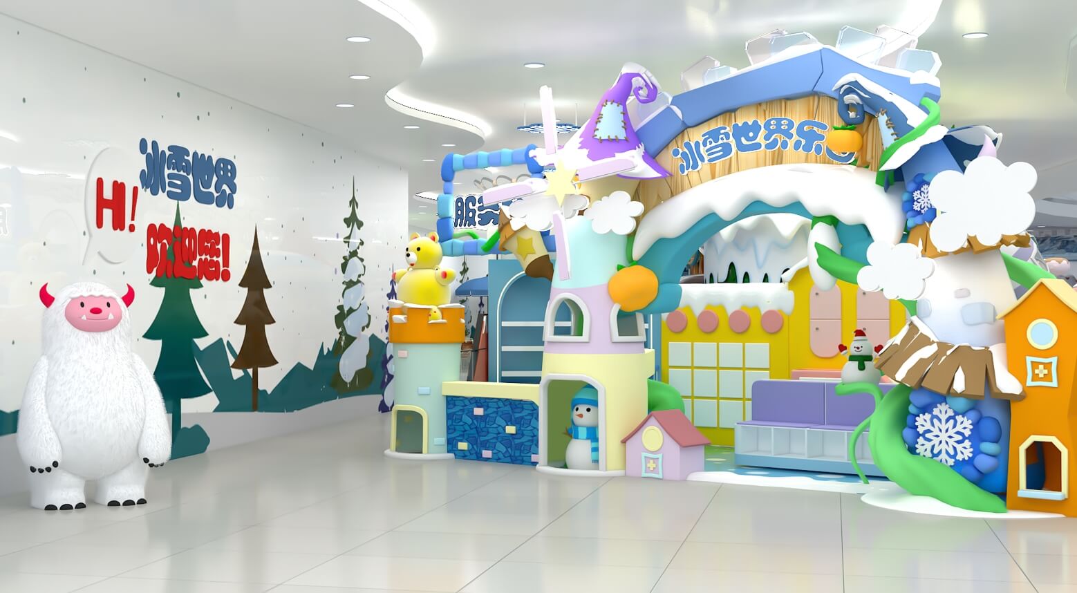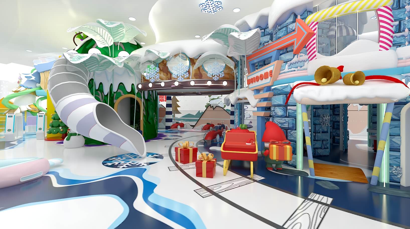 設計理念:皚皚白雪、剔透冰晶與冬日晴空,本應勾勒出冷色調的畫卷,而這座童話王國卻喚醒我們每一個人童年的靈動。樂園以“冰雪童話”為創作背景,以莫蘭迪色為色彩基調,通過穩定多樣的幾何造型構筑多維空間,營造差異化的冰雪場景,大人、孩子們置身其中,仿佛穿越到寒冷的冰川雪原探險。