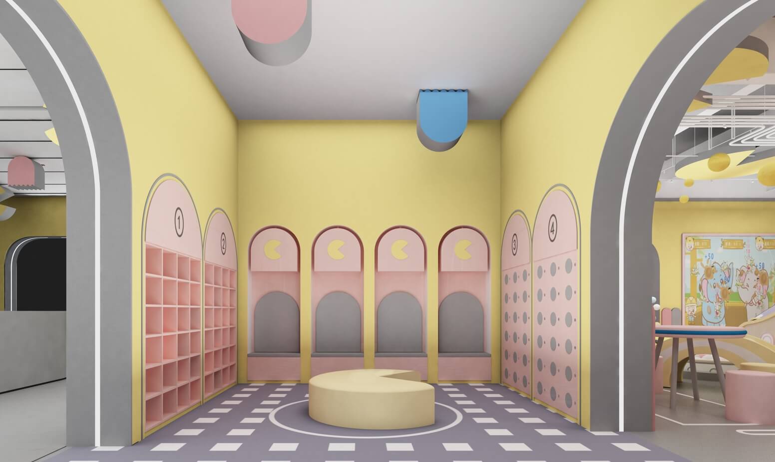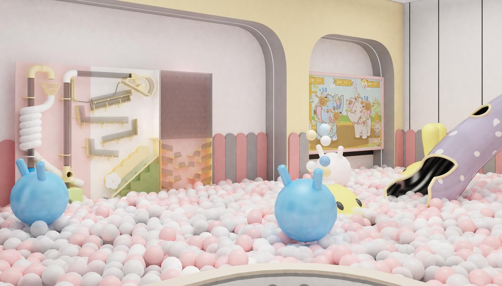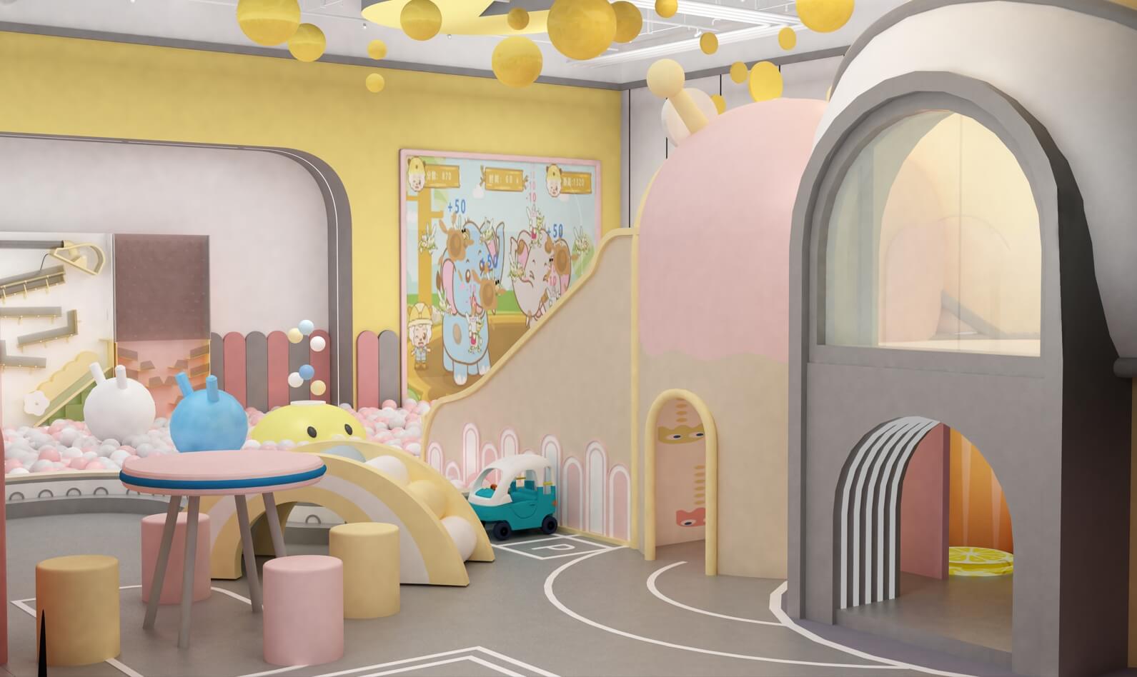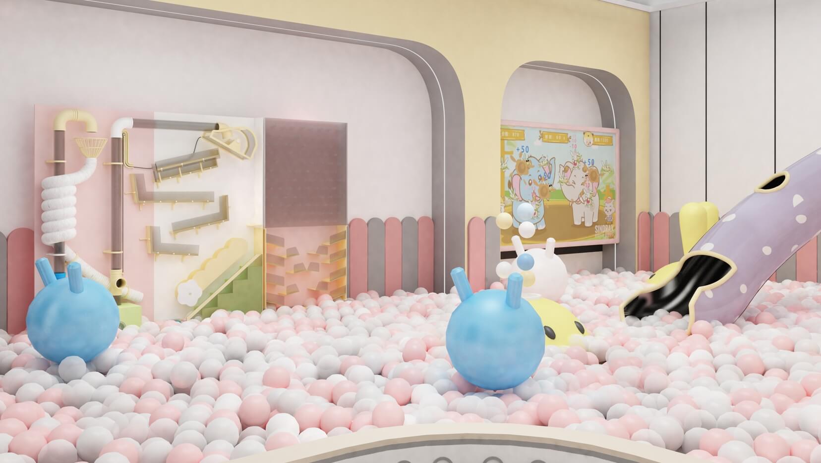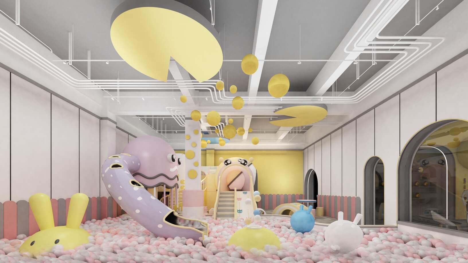 設計理念:孩子們有著無限想象力,每個想象中都隱藏著一個童話夢。樂園以“童夢”作為空間主題概念,從“奈爾寶+馬卡龍”汲取靈感,打造一個富有層次感、多元化的互動體驗樂園,巧妙的將跑、鉆、爬、攀、滑、翻、滾等功能性動作融于兒童的游樂之中,激發孩子的好奇心和探索欲以及對藝術想象力的無限潛能。