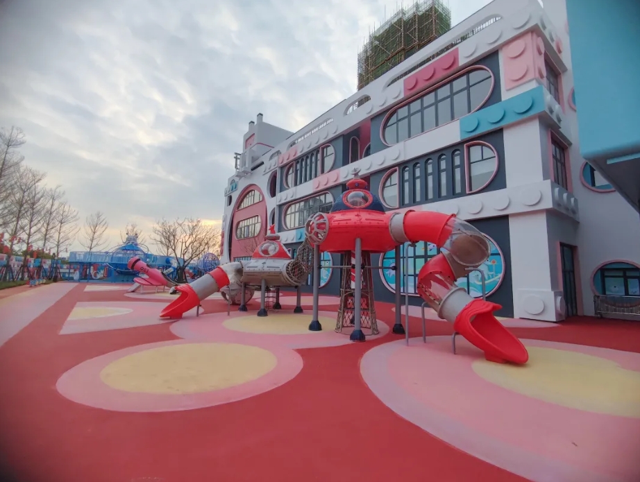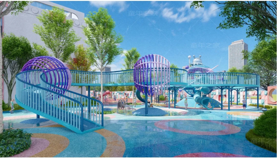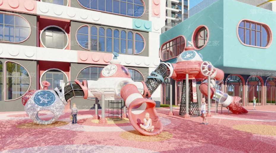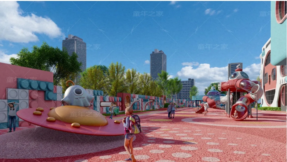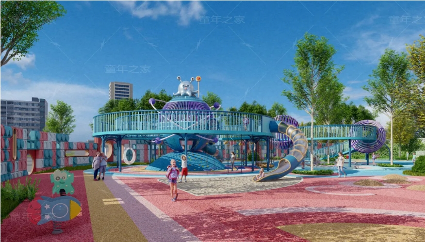 我們希望創造一個有趣的場所,讓小朋友都能記住它,并且在這里能夠產生一些美好的回憶。因此,童年之家為孩子們打造了超5000㎡星際主題游樂園,前期作為地產展廳配套,后期將改為幼兒園戶外游樂場。