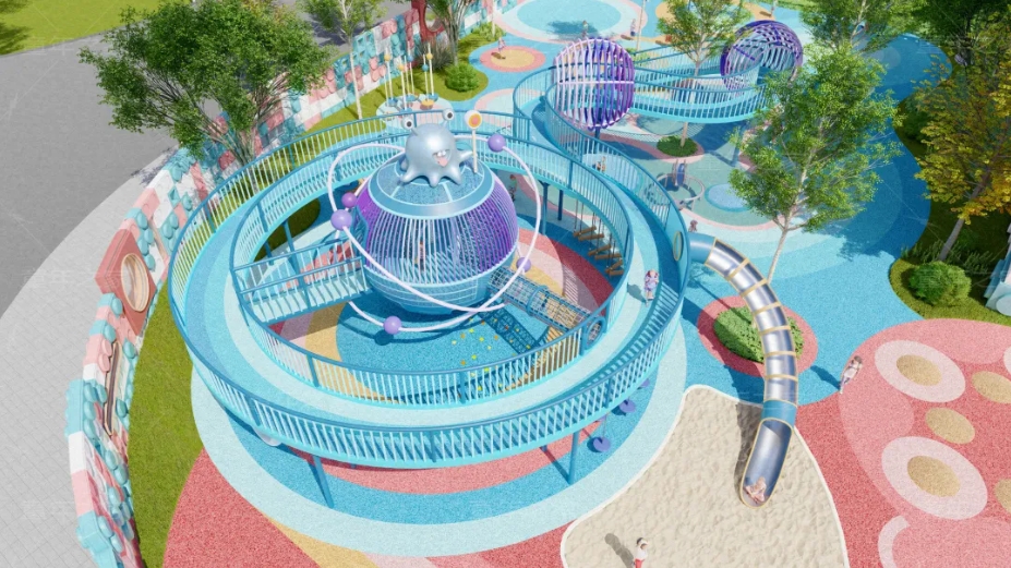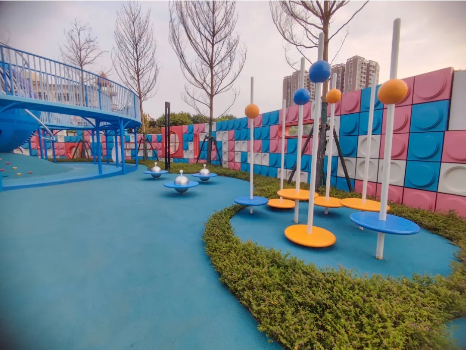 設計師結合不同高差的場地,運用靈動的圓呈現浩瀚宇宙中萬千變化的星球形態,設計不同的體育活動、探索場地,包括星球沙坑、飛碟滑梯和各種攀爬設施。讓孩子們的力量,平衡,柔韌性,協調性,敏捷度在探索中得到鍛煉提升。