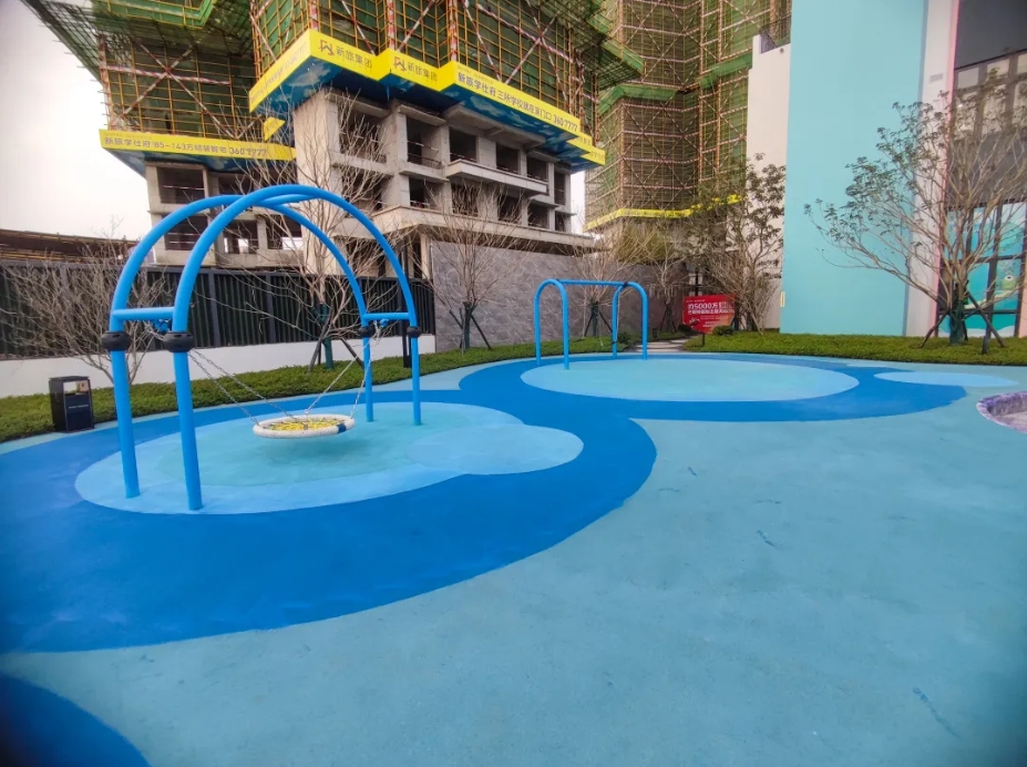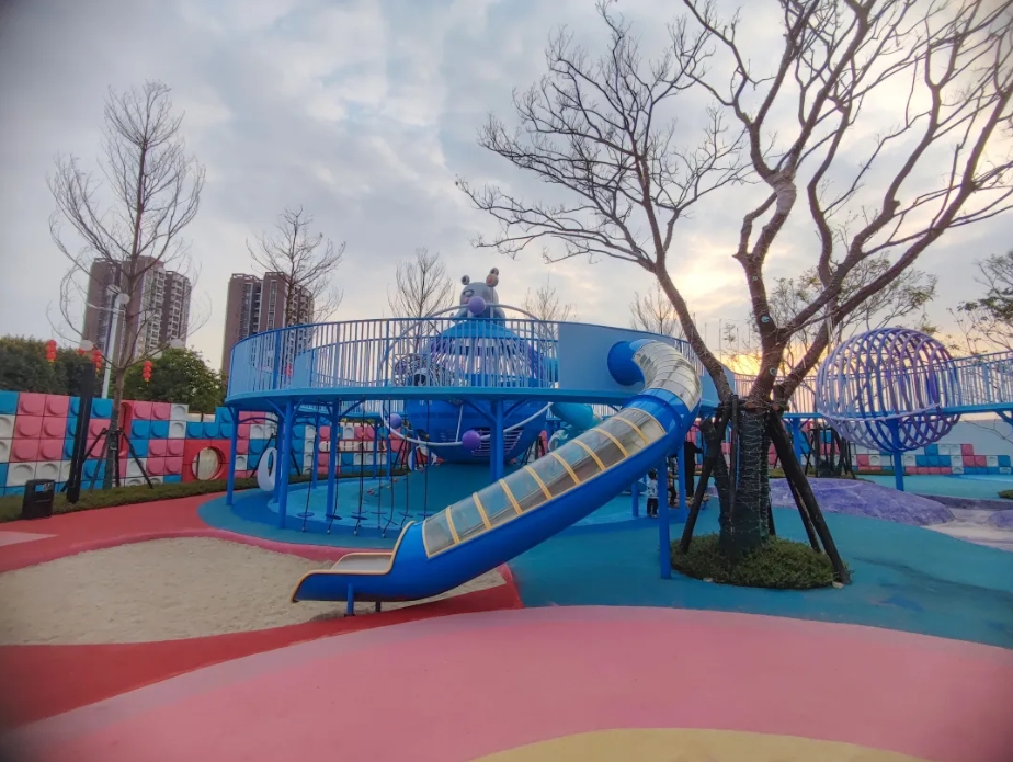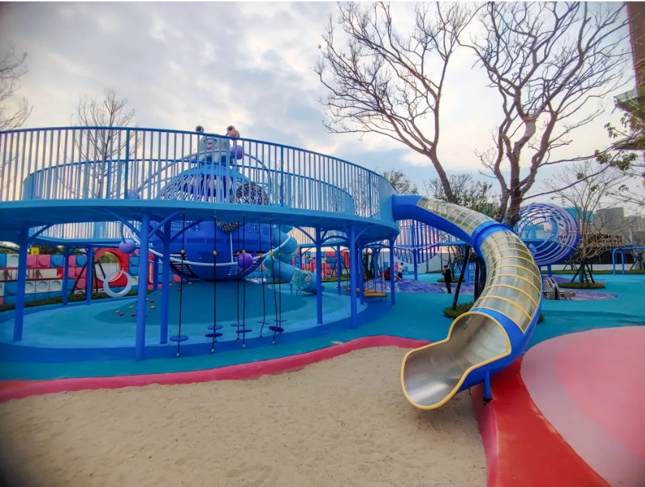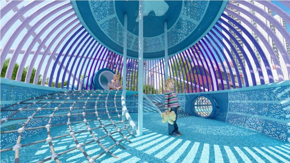 站立在藍色的設備里,仿佛置身于銀河星際之中,孩子們可以在“銀河星際”之中奔跑、跳躍,感受星球中蔓延的不同磁場力量,也可以站在星球里,透過縫隙俯瞰新旅學仕府的景觀。