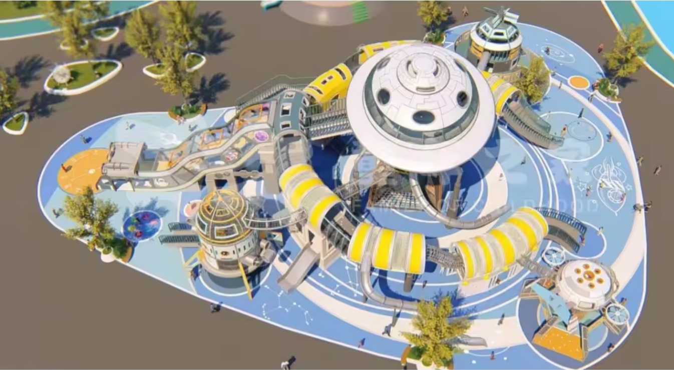 樂園切合太空“夢”主題,提煉了與之相呼應的設計元素,太空中的飛碟、火箭、衛星探測器、星球以及太空艙等夢幻元素,似乎已經在我們的想象中勾勒出了太空框架的畫面。當時光隧道化身為滑梯,當星座化身為攀巖點,即將開啟兒童的太空夢。