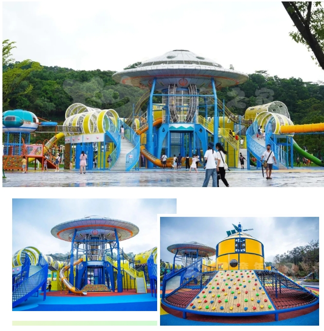 高峰處坐落著一個巨大的飛碟,太空艙穿行平臺將衛星探測區、火箭區與飛碟區連貫起來,形成流暢科幻的游戲場所。該設計的重點是創建一個非規范的游戲環境,通過攀爬、鉆網、爬梯、滑梯提供無限的路線。