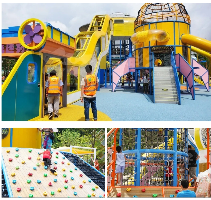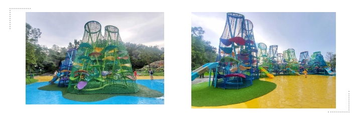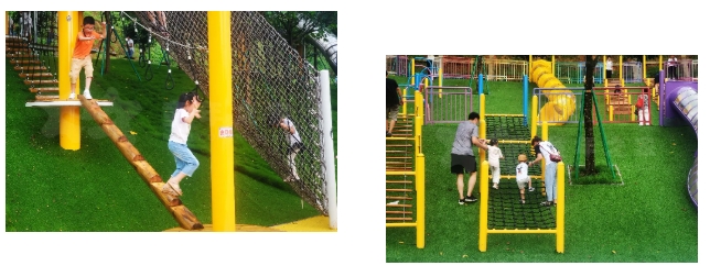各種角度的斜坡提供了大量攀爬的機會,還附帶了各式各樣的滑梯、鉆圈、蕩橋及不同尺度的階梯,以滿足各年齡層的兒童玩樂。