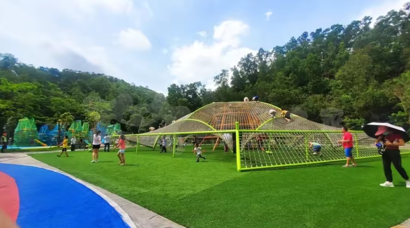 勇士攀爬項目占地面積為623㎡,以攀爬設備統領場地,融合弧形設計將多項元素串聯。探險者爬網、星座攀爬巖、秋千、滑梯、吊橋的組合,促進孩子們骨骼肌肉發育,同時也利于增強社交能力。