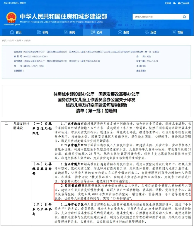 近日,住房城鄉建設部辦公廳、國家發展改革委辦公廳、國務院婦女兒童工作委員會辦公室聯合印發了《城市兒童友好空間建設可復制經驗清單(第一批)》,童年之家協助打造項目金牛區花照壁社區榮譽上榜,為城市兒童友好空間建設提供創新思路和優秀解決方案。