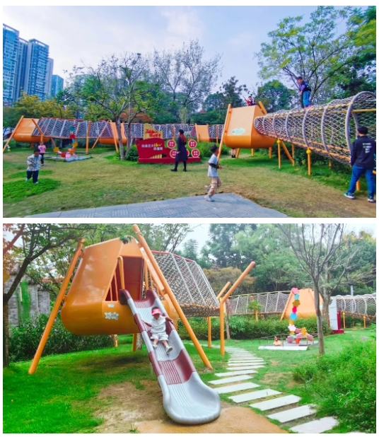 場地結合現有的樹木做功能設計,植入多種游樂功能(包括滑、爬、鉆等),提高趣味性和參與性,激發兒童的好奇心和探索精神。