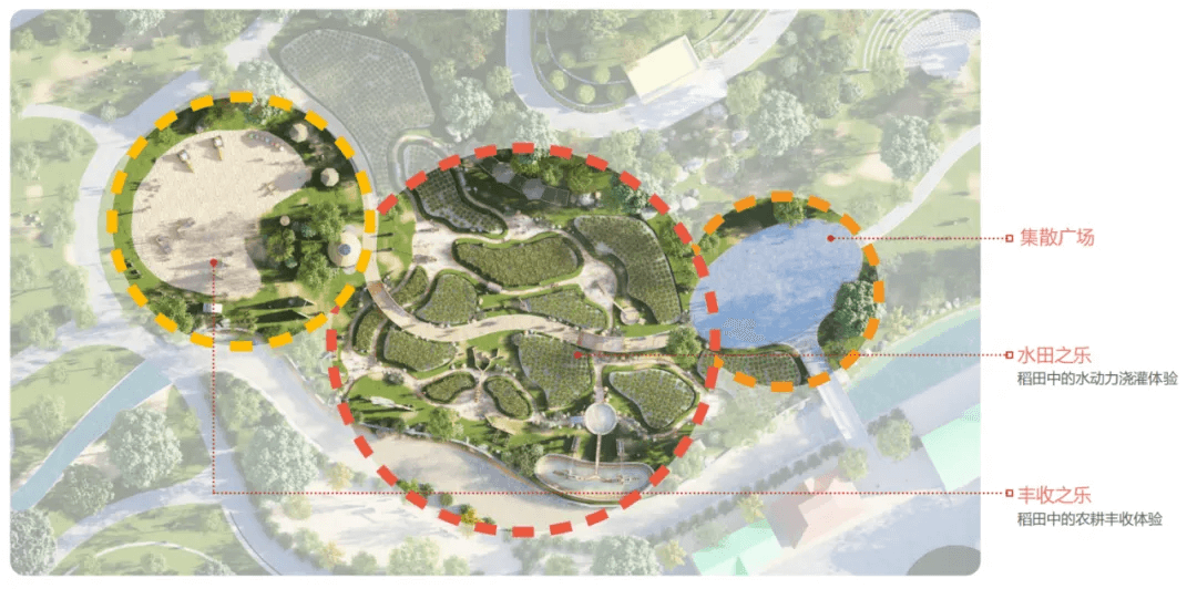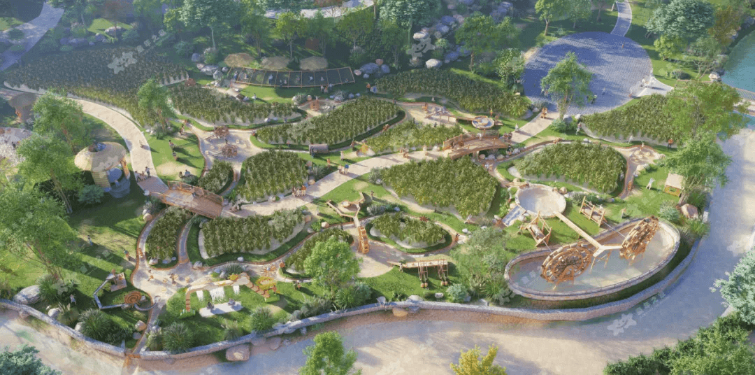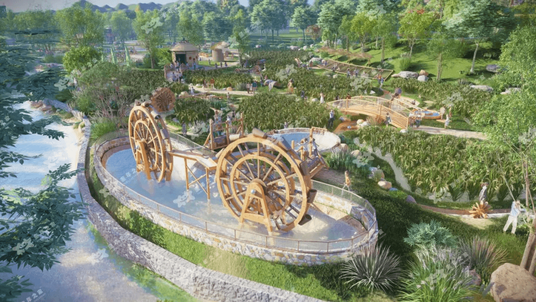項目以“種子”為主題,運用“灌溉”這一統一且具有連續性的設計語言串聯場地,利用地形的高低差異,設計不同層次的灌溉系統,如從高處引水,通過水渠、水槽等裝置,讓水流自然流到低處,模擬真實的灌溉過程,讓孩子們游玩中了解農耕文化。