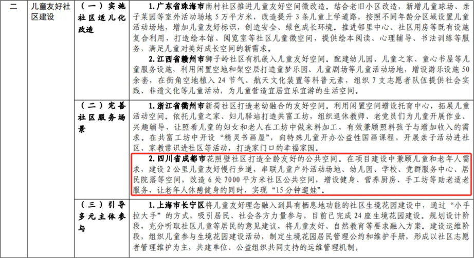近日,住房城鄉建設部辦公廳、國家發展改革委辦公廳、國務院婦女兒童工作委員會辦公室聯合印發了《城市兒童友好空間建設可復制經驗清單(第一批)》,童年之家協助打造項目金牛區花照壁社區榮譽上榜,為城市兒童友好空間建設提供創新思路和優秀解決方案。