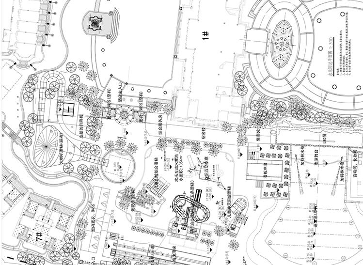 根據主題和功能分區,設計水上樂園的景觀環境,包括水景設計、綠化設計、鋪裝設計、節水系統等。